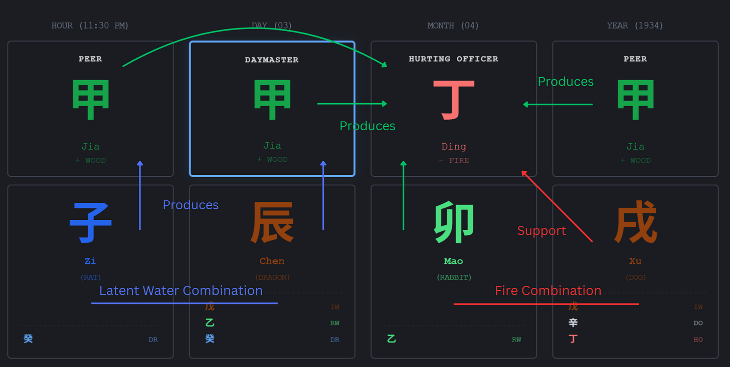 The chart is saved by the classical concept of a “Clear” (清 - Qing) energy flow. Rather than Water and Fire exploding against each other, her massive Wood Day Master and Companion/Peer stars acts as an indestructible mediator - a concept known as Tong Guan (通关 - Bridging the Pass). The energy flows in a continuous, unbroken chain: Water ➔ Wood ➔ Fire.