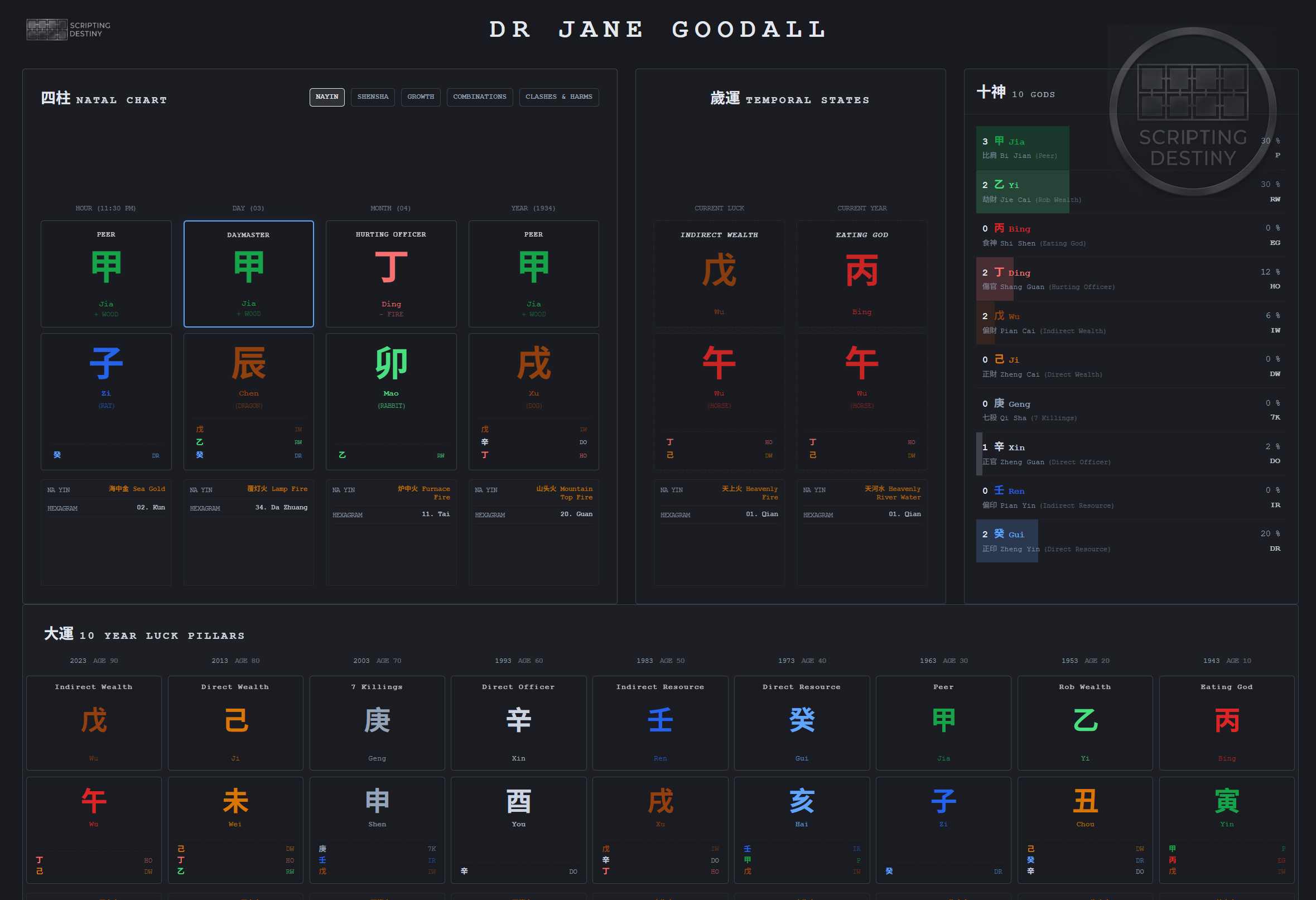 A chart with this much dense Wood (three Jia stems and a Mao month) evokes the visual of an overgrown, impenetrable forest. Unreleased, this energy becomes rigid and self-destructive. The chart’s true genius is the solitary 丁 (Ding) Fire sitting on the Month Stem - Goodall’s Hurting Officer (伤官). This provides a brilliant, focused outlet for her immense Wood energy, executing the classical rule: “Strong Wood getting Fire, only then transforms its stubbornness” (强木得火,方化其顽).