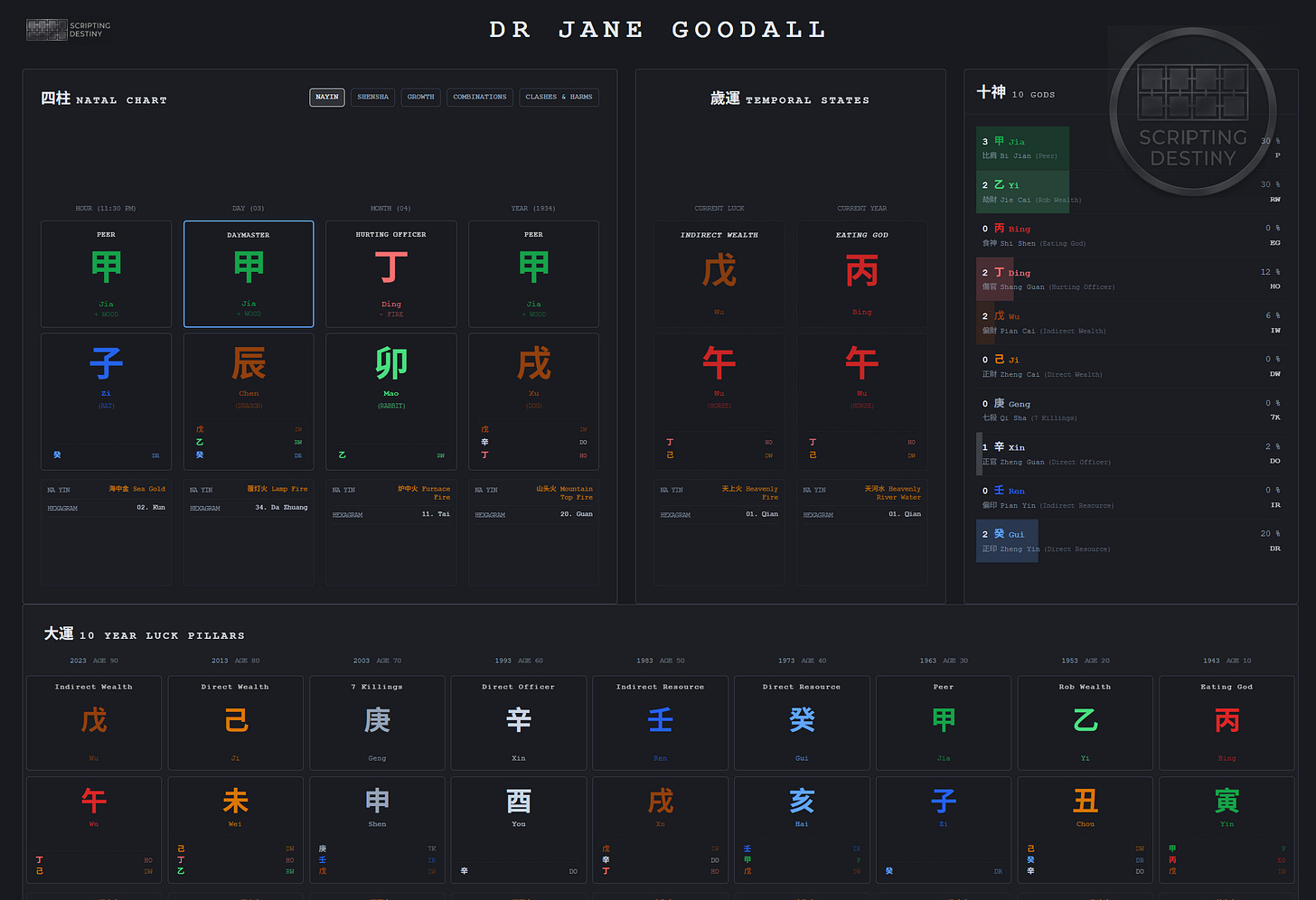 Crucially, this Earth serves a higher structural purpose: it roots her Day Master. In nature, a towering tree (Jia Wood) cannot stand indefinitely without deep, expansive soil. By converting her intellectual fire into tangible Earth - manifested in the real world as the Jane Goodall Institute and the Roots & Shoots program - she created the literal foundation necessary to anchor her life’s work.