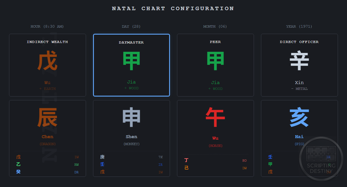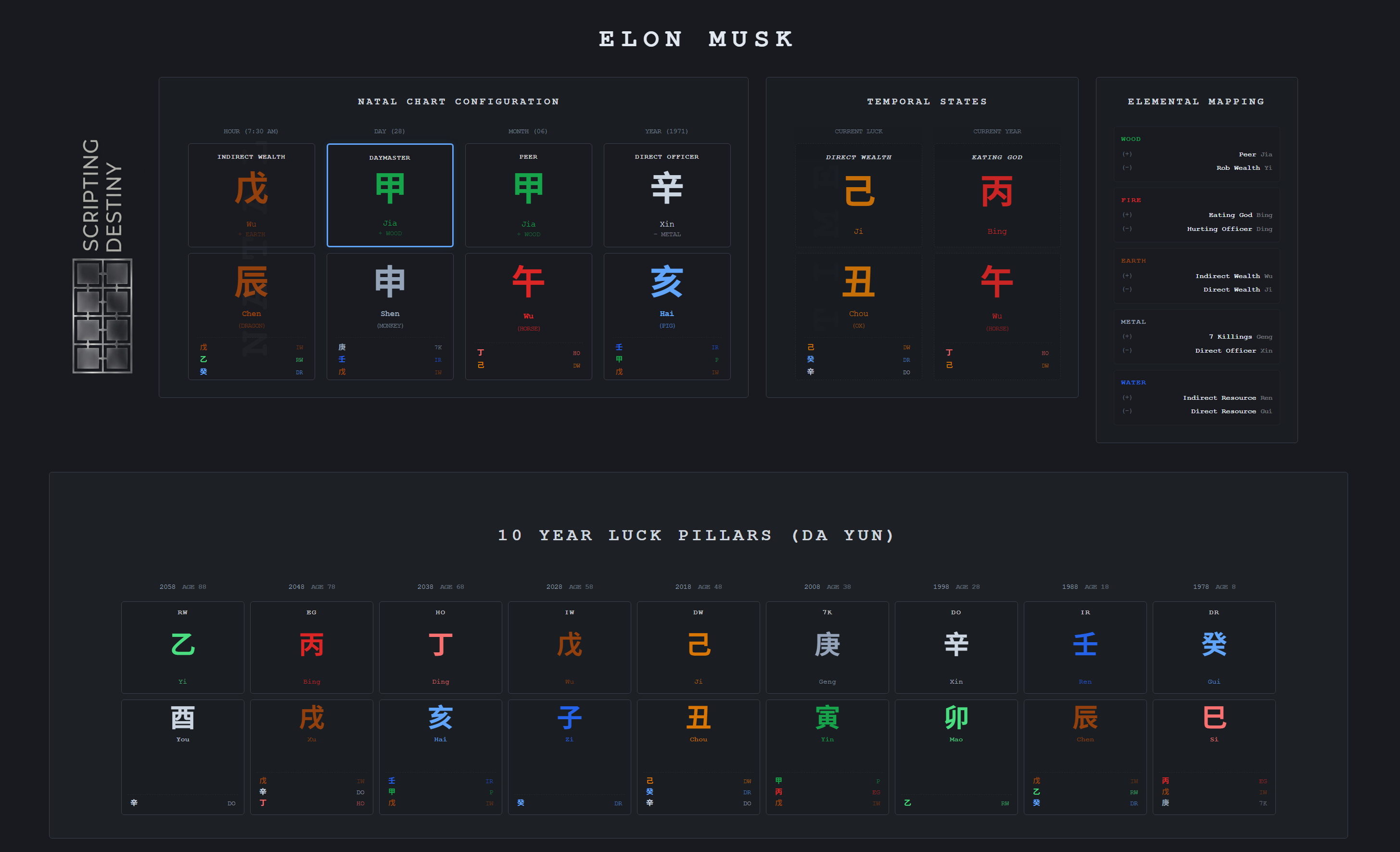 Musk’s chart possesses a billionaire’s blueprint. As a Jia (甲) Wood Day Master, his Wealth element is Earth. He was born in the peak of summer, represented by the Wu (午) fire, giving him an explosive production engine known as the “Hurting Officer”. As the month earthly branch represents the season one is born in, it is the most powerful influence in the chart. This star governs active intellect and expression, but unlike the gentle “Eating God” star, the Hurting Officer is rebellious, sharp, and defined by an obsessive need to dismantle the status quo.